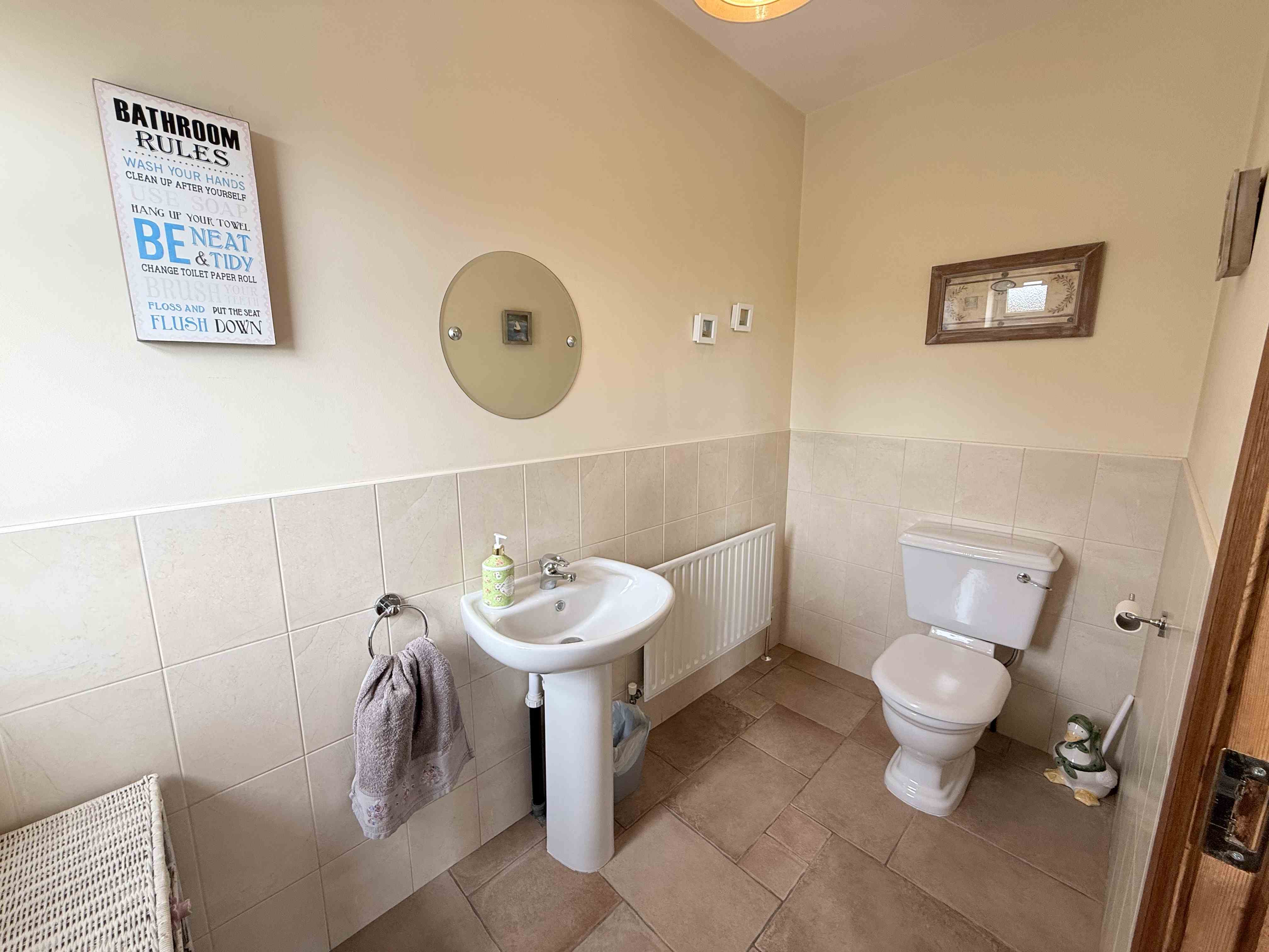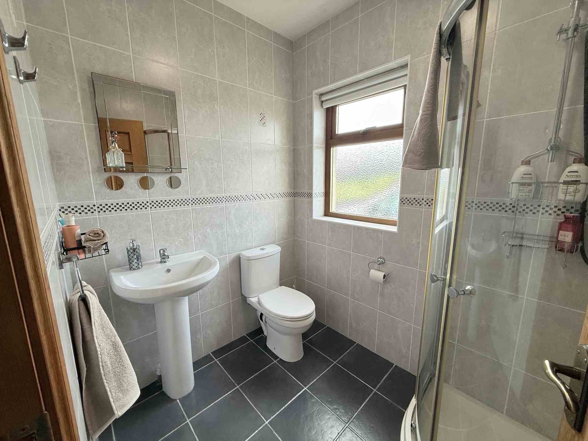 Comprising large jacuzzi bath, low level toilet with built in wc. Attractive vanity basin with mirrored accessory over and large thermostatic shower enclosure. Ceramic floor tiling throughout with complimentary full height ceramic wall tiling.